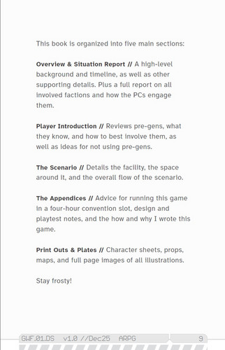- Book 01_Overview & Situation Report: A high-level background and timeline, as well as a full report on all involved factions and how the PCs engage them.