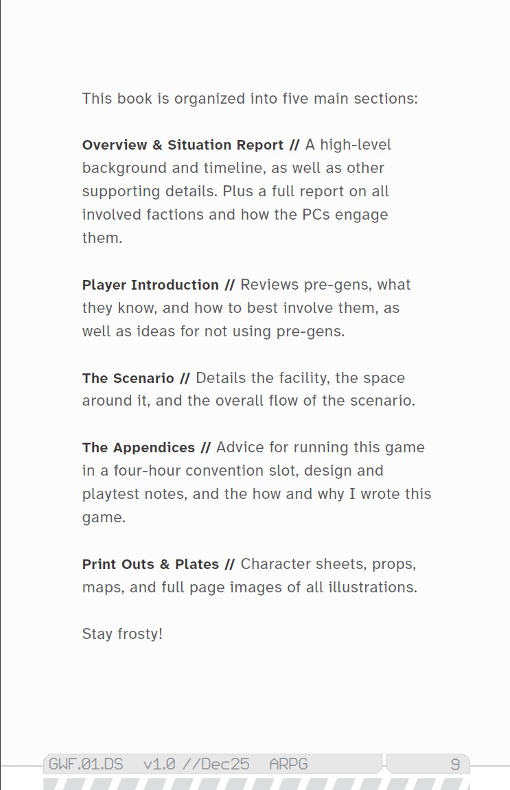 - Book 04_Appendices: Convention Play - Advice for running this game in a four-hour convention slot; plus Design & Playtest Notes - How and why I wrote this thing, plus what I learned about game design along the way.