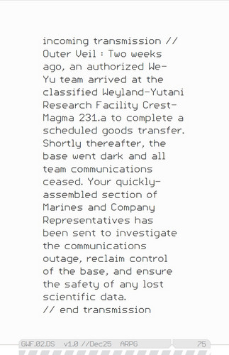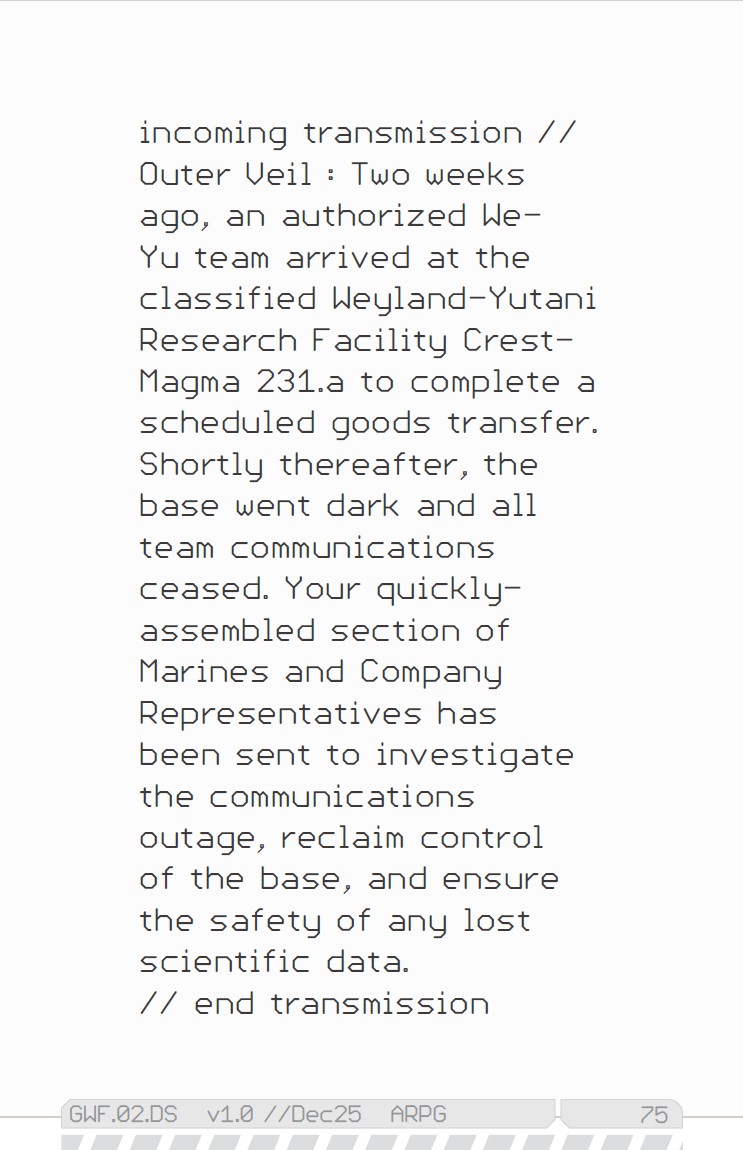 Outer Veil - Two weeks ago the classified Weyland-Yutani Research Facility Crest-Magma 231.a transferred goods to an authorized WeYu team. Shortly thereafter the base went dark and all team communications ceased. Your quickly assembled section of Marines and Company Representatives has been sent to investigate the communications outage, reclaim control of the base, and ensure the safety of any lost scientific data.